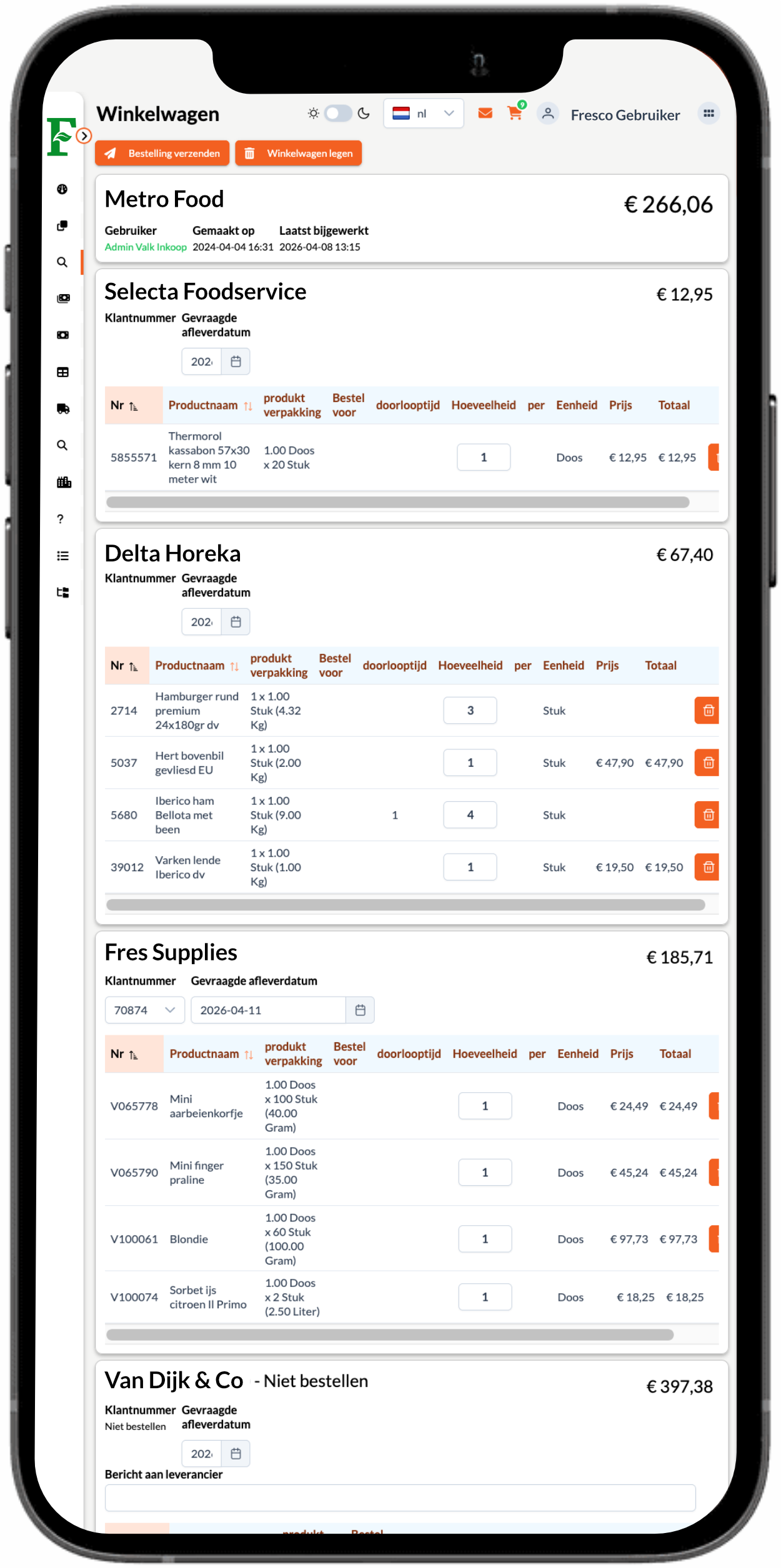 Log in en krijg direct toegang tot jouw volledige assortiment, gekoppeld aan je eigen geselecteerde leveranciers. Toegankelijk op elk scherm en voor al je personeel, zodat iedereen altijd met dezelfde, actuele informatie werkt.
